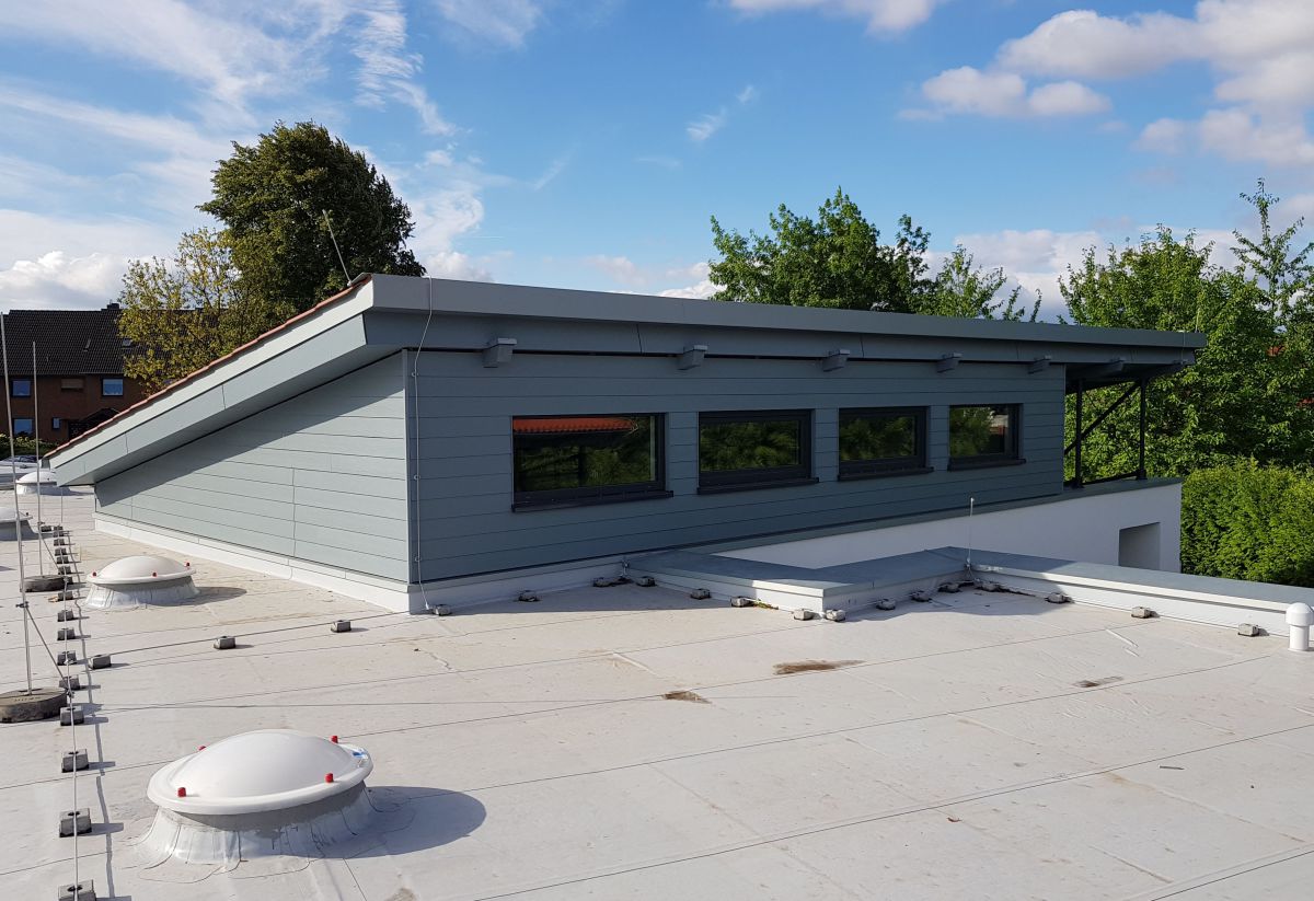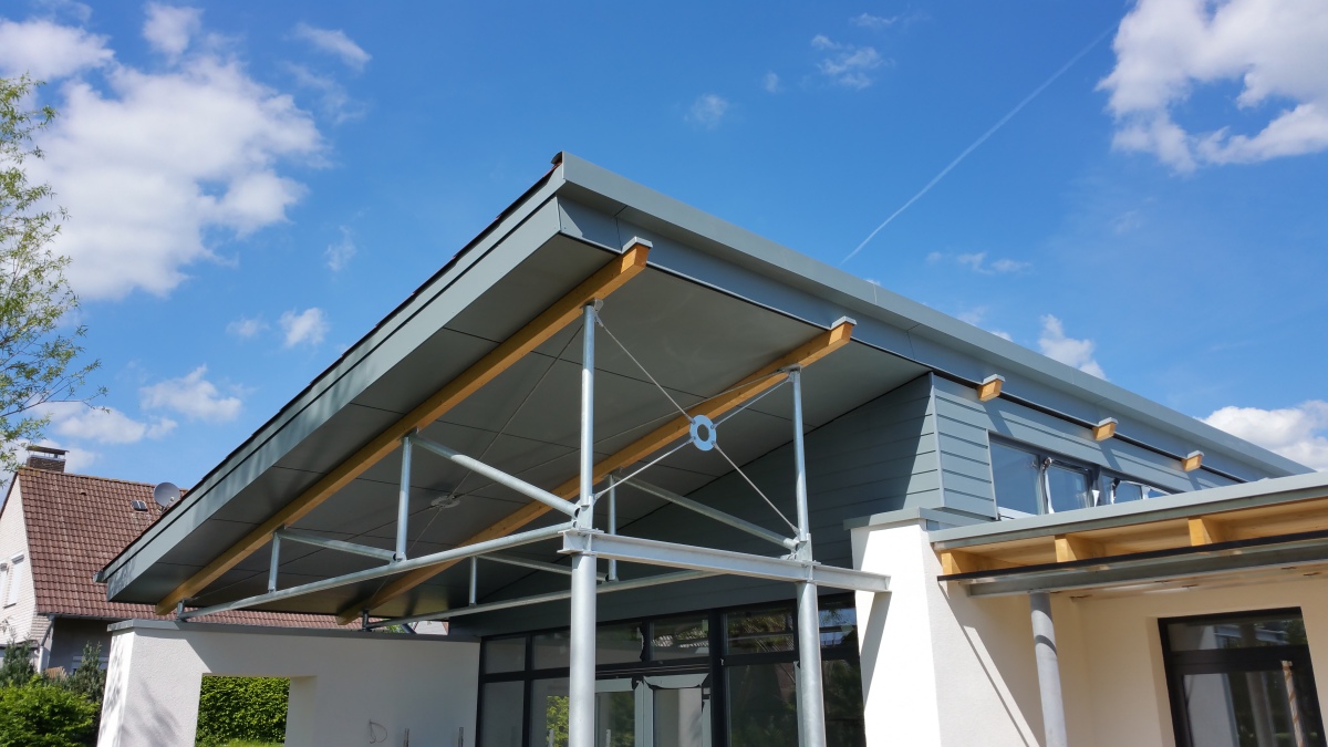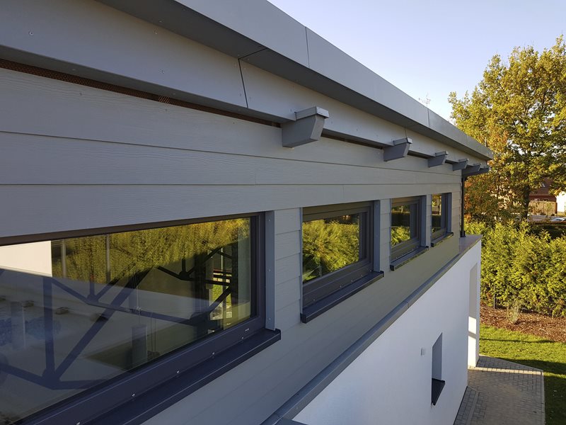 Głównego architekta ostatecznie przekonała realistyczna i naturalna faktura drewna desek włóknocementowych James Hardie, a w szczególności to, że okładzinę można wykonać w kolorze antracytowej szarości, aby dopasować ją do lakieru stalowych belek. Pomimo dodatkowych kosztów w wysokości około 5%, rada zażądała ponownej wyceny. "Gmina porównała koszty tych dwóch opcji", mówi architekt Frank Guder, dodając:Wynik porównania pokazał, że większe koszty byłyby amortyzowane już przy pierwszym remoncie."